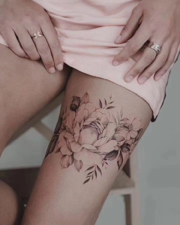 性感大腿纹身 女士大腿处性感的花花纹身图片