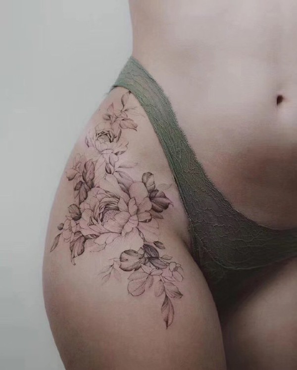性感大腿纹身 女士大腿处性感的花花纹身图片