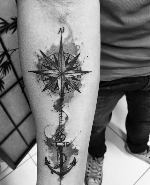 纹身指南针 水彩与线条结合的指南针纹身图案