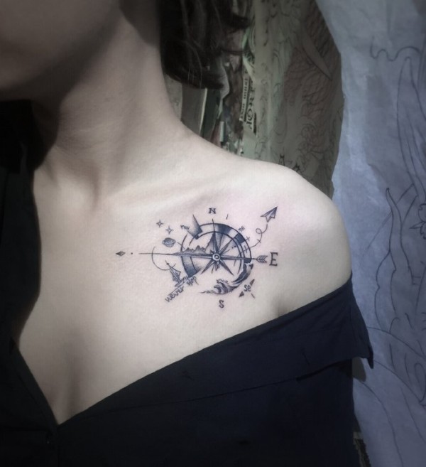 纹身指南针 水彩与线条结合的指南针纹身图案