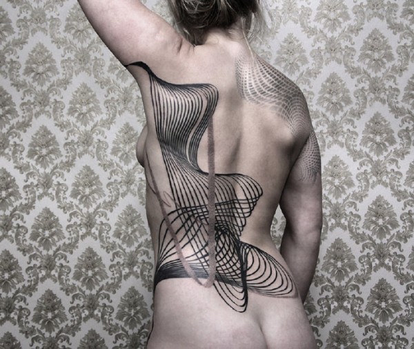 女生后腰纹身黑白灰风格抽象线条纹身图案