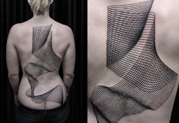 女生后腰纹身黑白灰风格抽象线条纹身图案