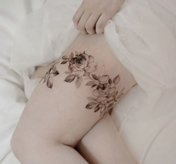 女性大腿上的性感一组繁花纹身图案9张