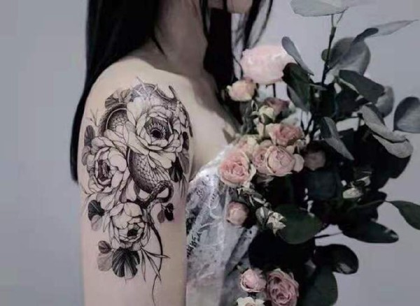 女生肩部的黑灰素花纹身作品图