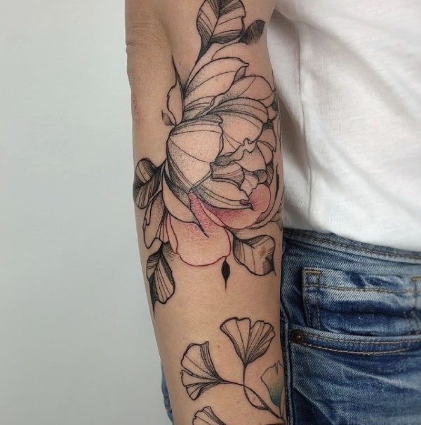 纹在手臂胳膊上的黑灰素花花卉纹身图案欣赏