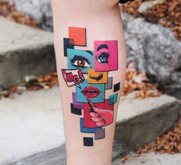 男生小腿上彩绘几何线条骷髅和人物肖像拼接纹身图片
