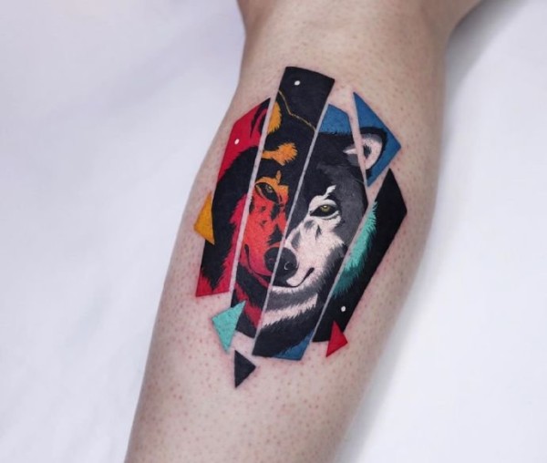男生小腿上彩绘几何线条骷髅和人物肖像拼接纹身图片