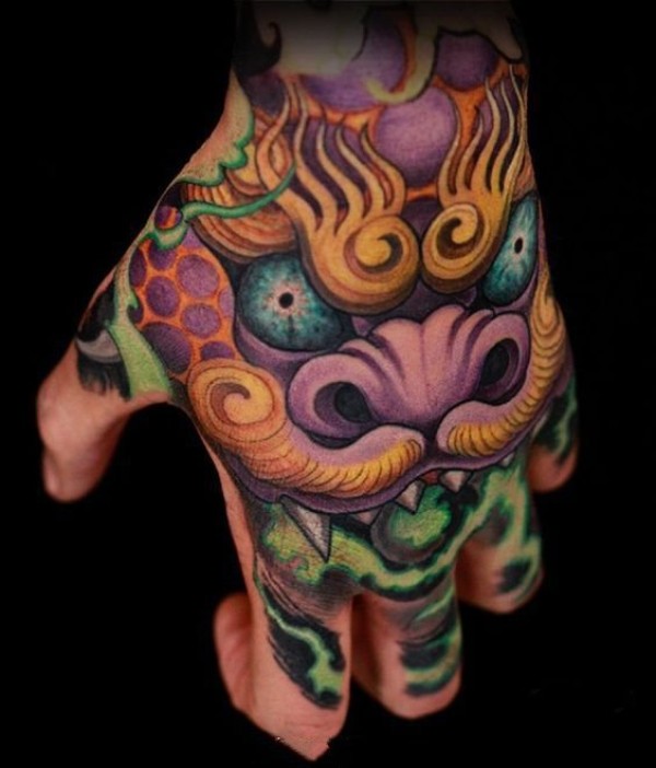 一款彩色的唐狮纹身图案