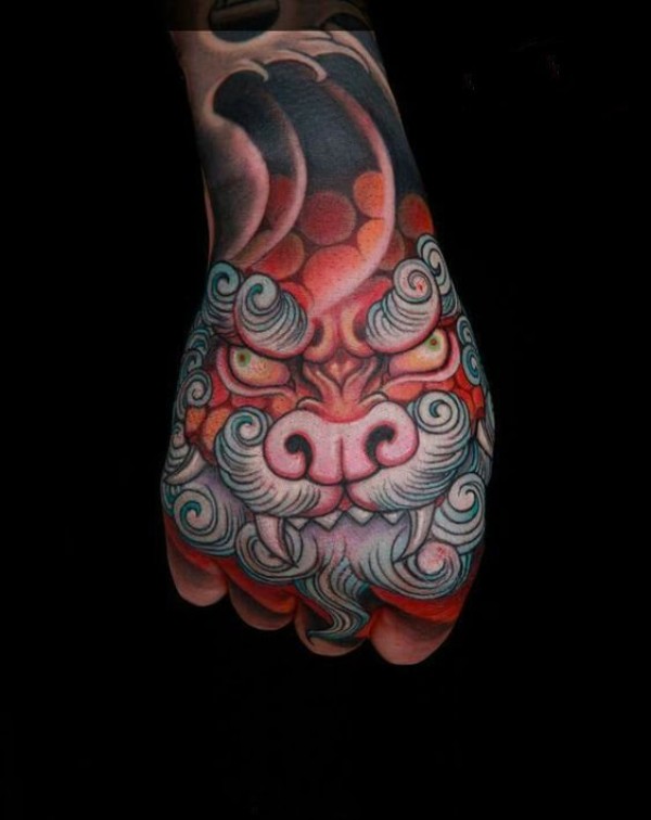 一款彩色的唐狮纹身图案
