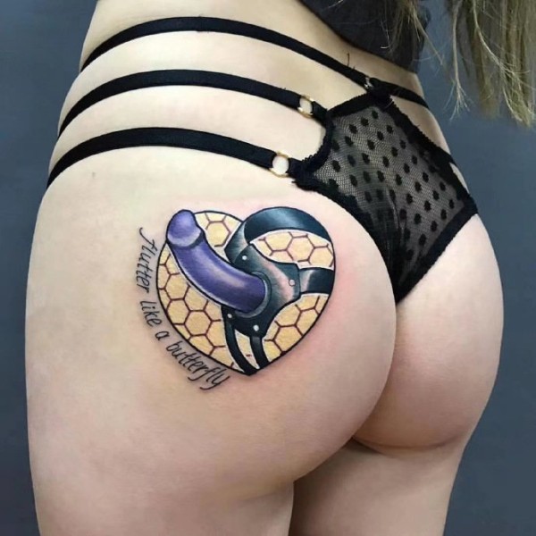 女性屁股上调皮的吐舌头的嘴巴纹身图片