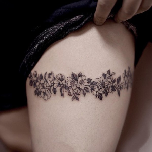 大腿素花纹身 女士大腿处性感的素花纹身图片