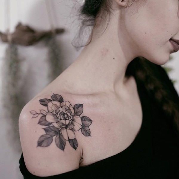 女生肩部的黑灰素花纹身作品图