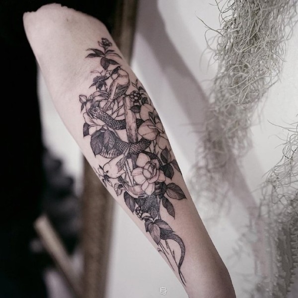 大臂素花纹身 9款女士的大臂黑灰花朵植物纹身图案