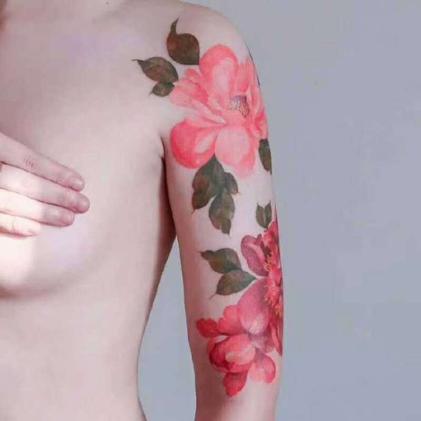 纹在手臂胳膊上的黑灰素花花卉纹身图案欣赏