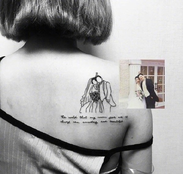 纹身照片 女生大臂上彩色的情侣结婚照纹身图片
