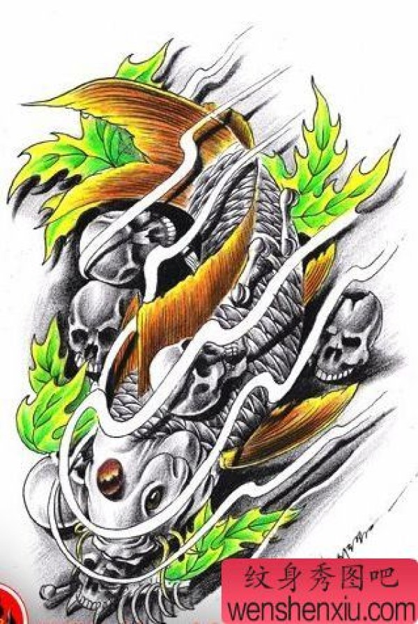 经典时尚超帅的鲤鱼锦鲤叶子骷髅纹身图案(精品)