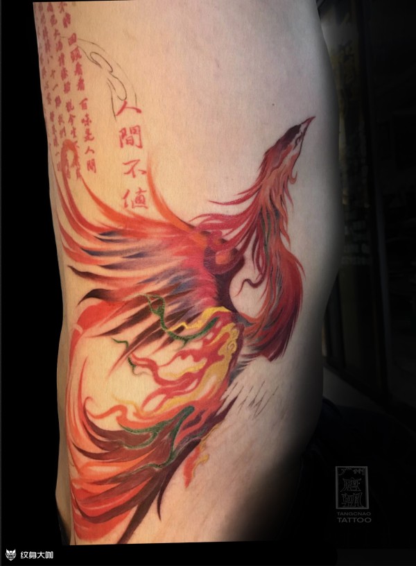 原创满背凤凰分次完成,凤凰头部,和火焰部分,已经脱痂恢复后的状态颜色饱满,翅膀和尾翼新上色