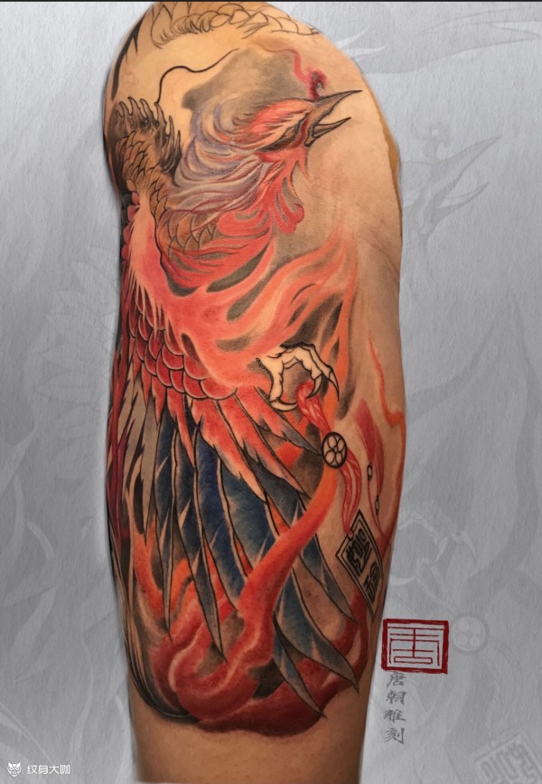 花腿凤凰客人想要一款涅槃凤凰,在沟通后确认客人要的方向,加上我自己理解建议来设计,用火焰,火焰的颜色分3重颜色暗,中,亮,来表现涅槃,客人的要求加入文字,在设计时巧妙结合用爪来拿着平安结把文字融入里面