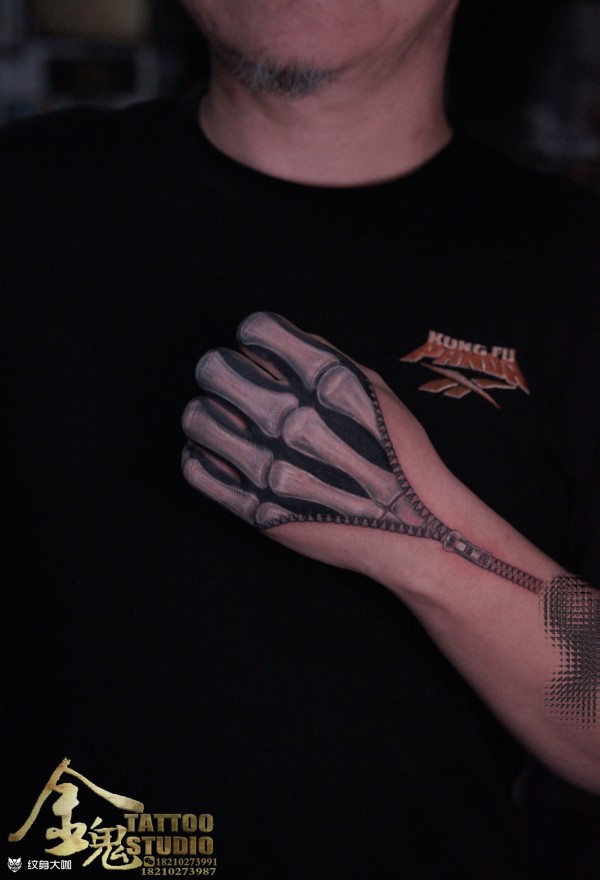 手面纹身来个狠的[666]全程大哥都说不疼[捂脸] 是真的牛[强]拉链 拉开后 露出 骨骼 骨骼纹身