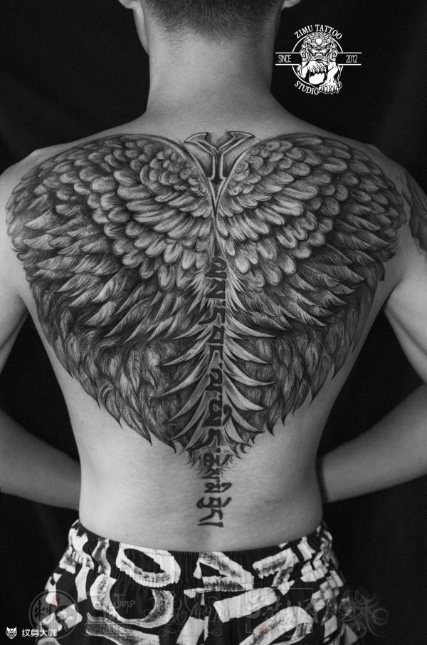 女生背部黑灰素描点刺技巧霸气大面积满背翅膀纹身图片