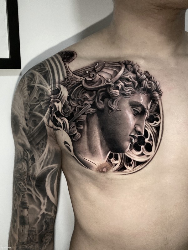 雕像一枚胸口新纹的雕像,手臂上恢复两年,肩膀部分留了部分空间等另外一边胸纹完后再加图衔接胳膊上的图