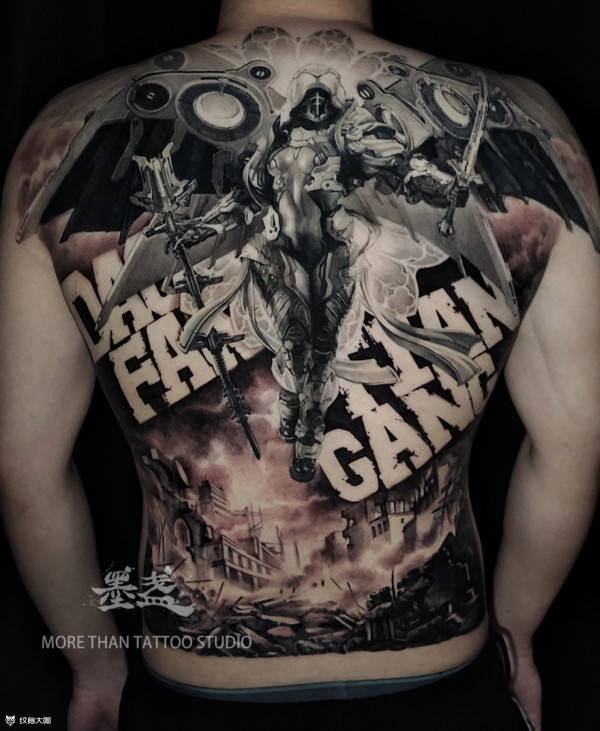 一组满背大气九龙拉棺纹身图案作品和手稿