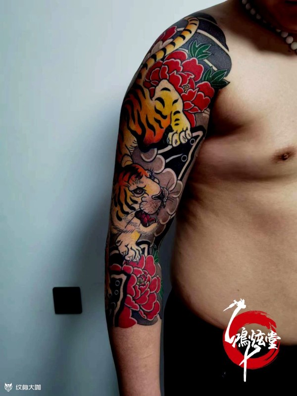 老虎牡丹七分袖纹身文化—王者风范 此作品的文化理念是通过纹身来提醒激励承载者保持勇敢和坚定的信念。激励自己客服困难,压倒一切,成为王者。在构图上以大气为主来体现王者风范。颜色搭配设计方面主题老虎在本色
