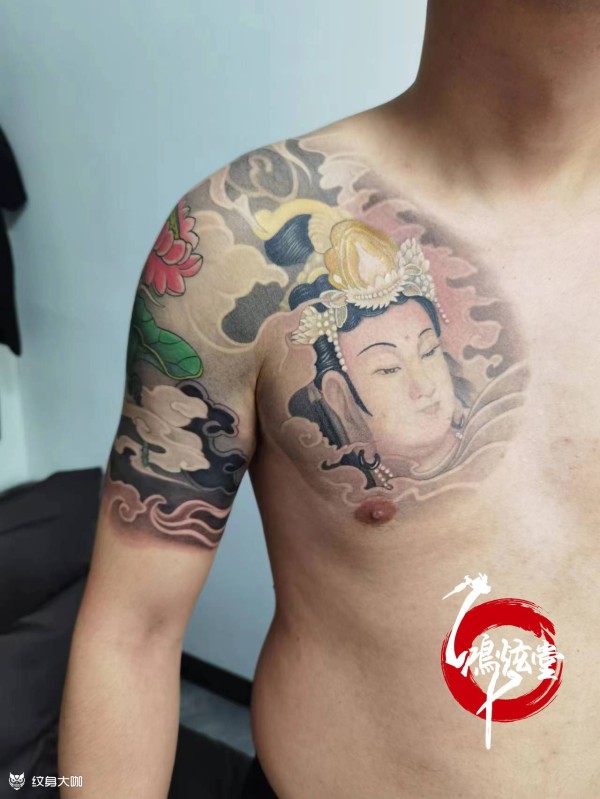 此半胛是根据大势至菩萨画像设计,前胸大势至菩萨头像,大臂是大势至菩萨法器莲花,背景以祥云为主,体现出祥和喜乐的意境。大势至菩萨代表的是智慧,慈悲喜舍,力量,光明。也代表行,所到之处佛光永照,化煞化凶。