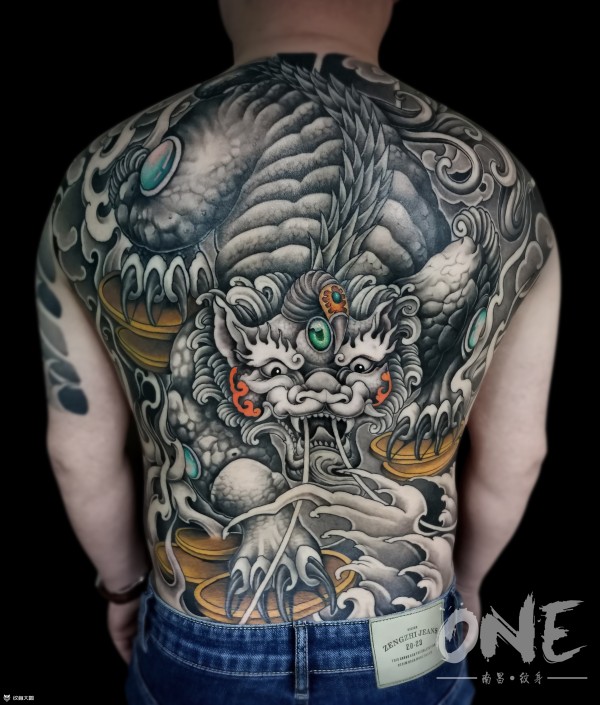 聚财貔貅纹身过程客人一直有纹身的冲动,等成家立业以后,为给自己生意取得更好的收获,选择聚财貔貅满背!完成图为恢复后的效果
