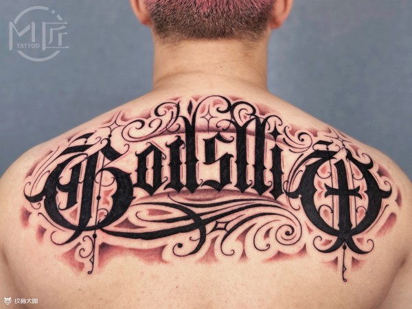 后肩花体字【花体字纹身】因为纹在后肩,采用了反转技巧,让整体构图更对称。