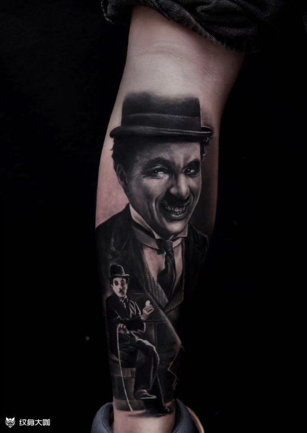 欧美写实|卓别林卓别林就是一代传奇!作为演艺工作者是天花板!更是喜剧演员的天花板! 写实纹身·小腿纹身·原创设计◾️纹身作品◾️