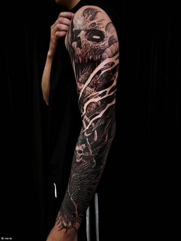 暗黑包臂外地的顾客终于能来了!这四天的包臂作品,小臂是个遮盖几乎都是结合着设计的,所以整个图都是每天现场画一面纹一面