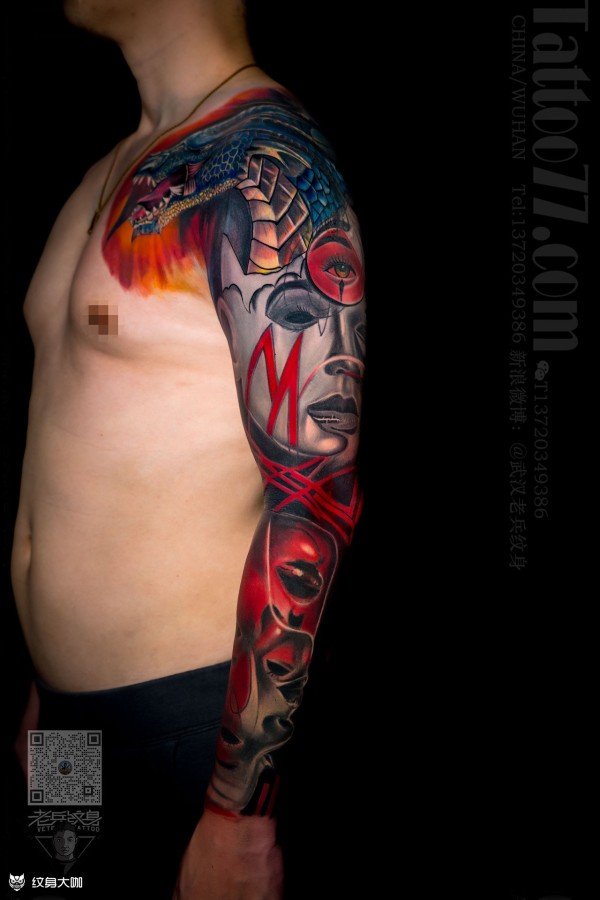 黑与红:欧美彩色写实作品,遮盖客人超级喜欢红黑色系,元素有面具脸,欧龙,写轮眼,和花体字,耗时40多小时…