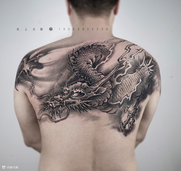 后背水墨龙無上出品——水墨龙生于东方,云游于天地之间,载大德大仁,承于水至于心。善变化,兴云雨,利万物,智者知。