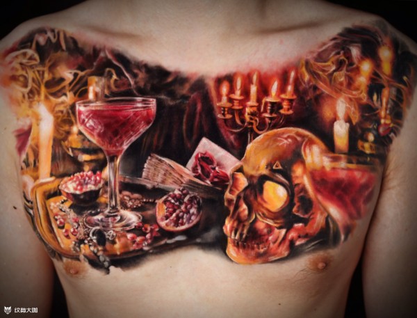摇晃的红酒杯纹身|摇晃的红酒杯,不寻常的美纹身图案是暗红色系与金色作为主色调,灯火蜡烛、觥筹交错的酒杯、石榴、骷髅。酒杯里的martini是一个仪式、一个神话,是危险又迷人的存在,提醒我们在有限的就经