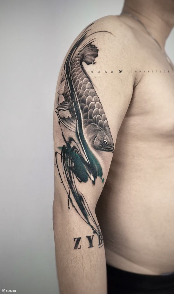 大臂金龙鱼無上出品———金龙鱼金龙鱼寓意:富足、吉祥、财富,象征着吉祥富贵、招财。胸鳍似龙爪,形似神龙。盘旋灵动,华贵端庄,静时安若处子,动时迅如脱兔,顾客还在两小臂内侧纹上孩子的名字缩写
