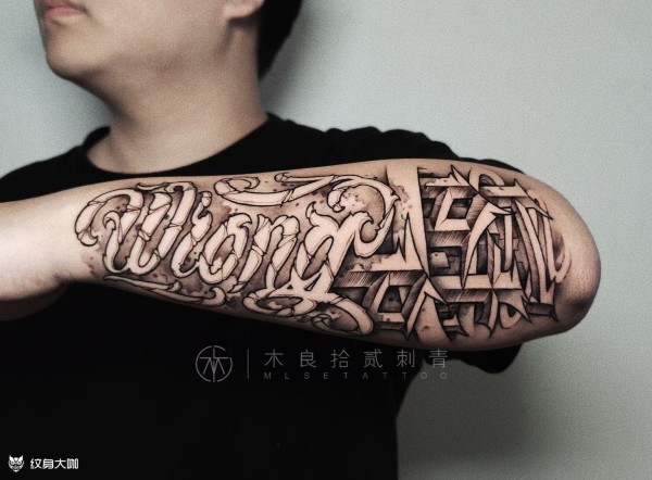 中国有嘻哈TT手臂上花体英文纹身图片
