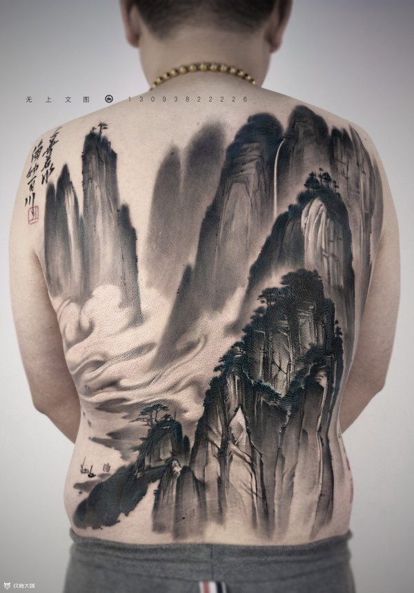满背山水無上出品——中式水墨山水满背 云雾缭绕景色秀,山色墨染叠层峦,门前静看秋色晚,無上山水画中仙,仿佛置身于苍苍莽莽的群山丛中,只觉墨气腾然,岚气四起,無上用写意玩转墨色情趣,构图精巧,布局深稳