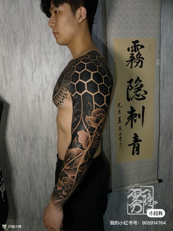 图腾,修改修改半胛图腾,加花臂,用时七天。这样的风格也就只能这样的肌肉男能驾驭了,小臂没有延续图腾,而是设计玫瑰花,用了不同以往写实的手法,而是用了图腾式,做黑是个体力活。扎的我头晕眼花。