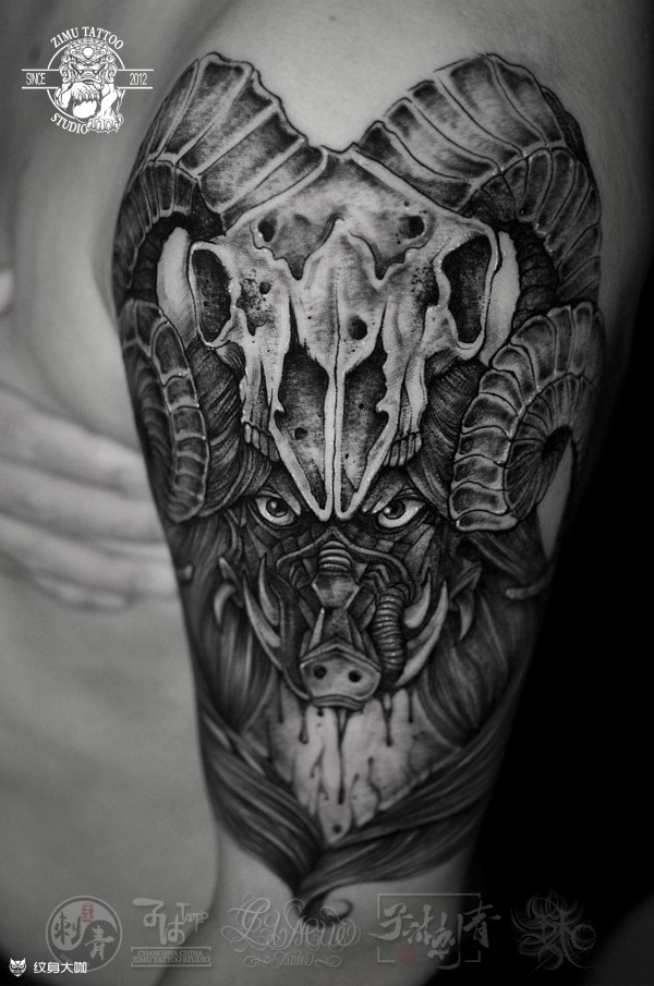 生肖贵人 羊与机械野猪生肖贵人 羊与猪 大臂外侧机械野猪 内侧书法与海浪