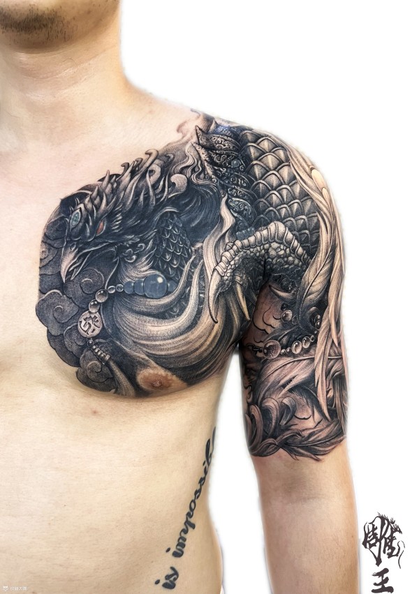 #凤凰#胸口#遮盖遮盖纹身此作品耗时四天完成的成品作业,以凤凰为主元素其他元素来源于客人构思如下:手牌仪字取自客人女儿名字,故此作品取名凤凰来仪;凤凰代表着幸福祥瑞吉祥,望女成凤。同时也表达夫妻感情和