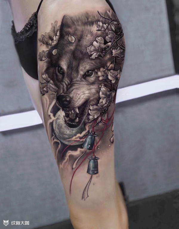 写实纹身|狼|玉兰花•by 阿开来自重庆的辣妹子。最初的设计与作品有很大的出入。美女执意要狼与玉兰花。于是我们将狼的野性保留,配搭风铃衬托出女人的柔美。