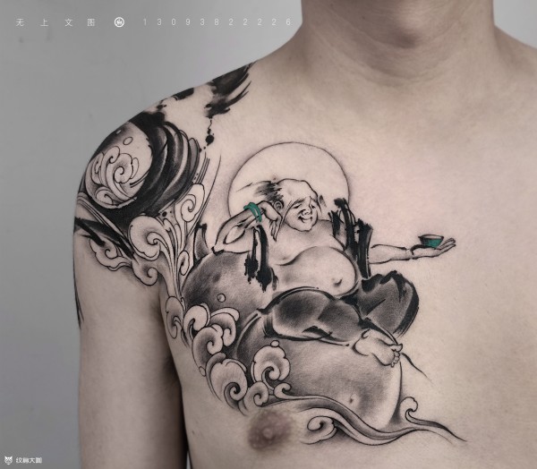 《福气-运气-勇气》無上出品————平安喜乐的福气(福禄),一飞冲天的运气(老鹰),要逆流而上的勇气(书法勇气),运用书法贯穿作品,起到承上启下、平衡止乱之效。水墨刺青构图与创作者的思想是不可分割的,