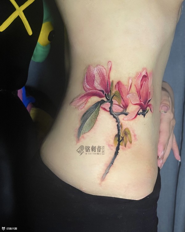 女生玲珑腰部的依兰花图案纹身女生腰部嫣红底_腰部纹身图案大全_纹身图吧