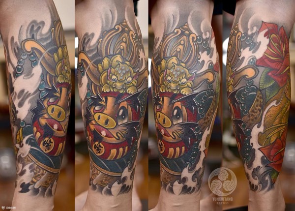 达摩包小腿Jackie作品达摩与天秤结合,融入了新传统元素,达摩腹部的文字代表家人,内侧是山羊,寓意星座。