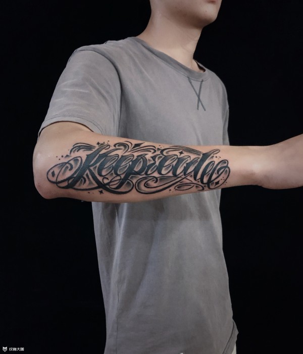 中国有嘻哈TT手臂上花体英文纹身图片