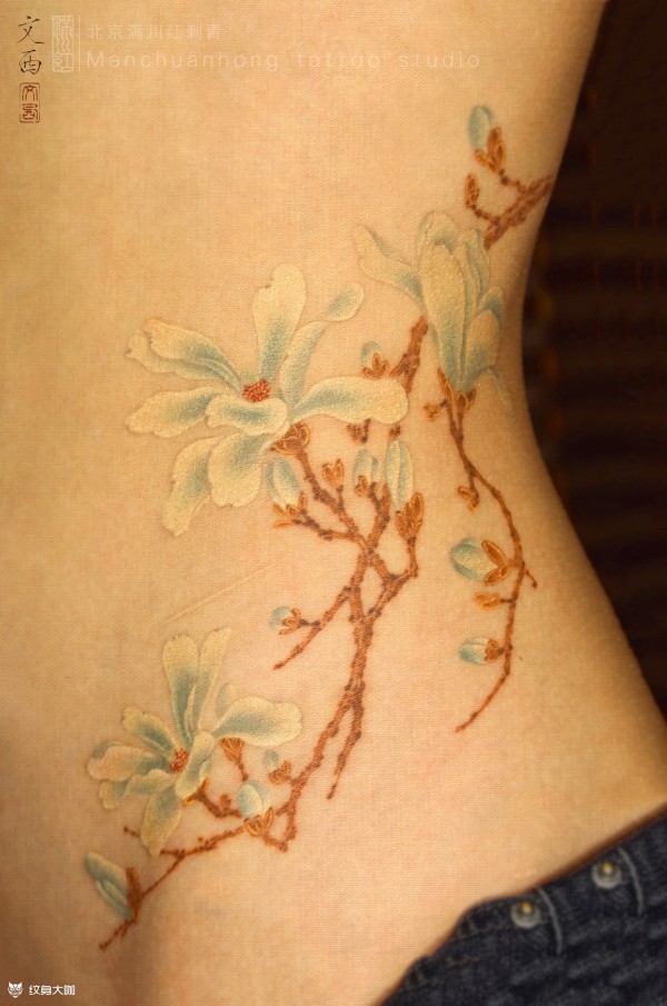 女生玲珑腰部的依兰花图案纹身女生腰部嫣红底_腰部纹身图案大全_纹身图吧