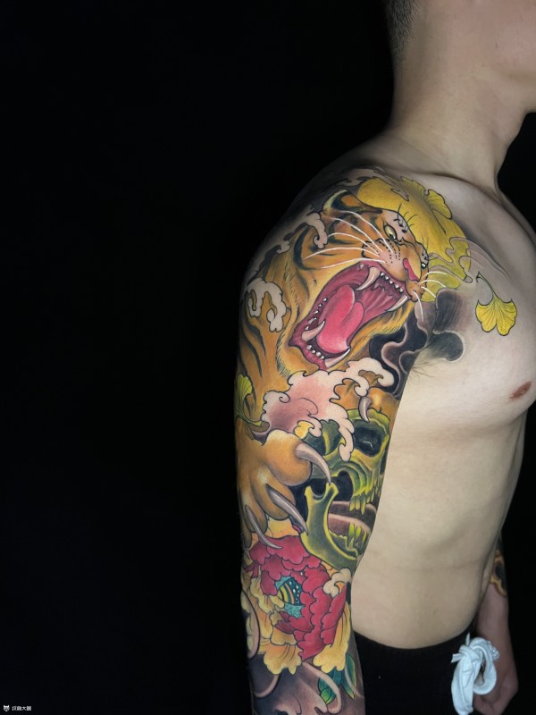 老虎花臂⚜️设计理念 因为客人的母亲属虎的,我把形态做的比较凶一点,把达了守护的寓意,另外牡丹花代表着富贵的意思,加了点银杏叶,代表着落叶归根的意思。