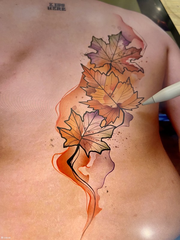 为客人定制图案,遮盖后背的胎记。枫叶