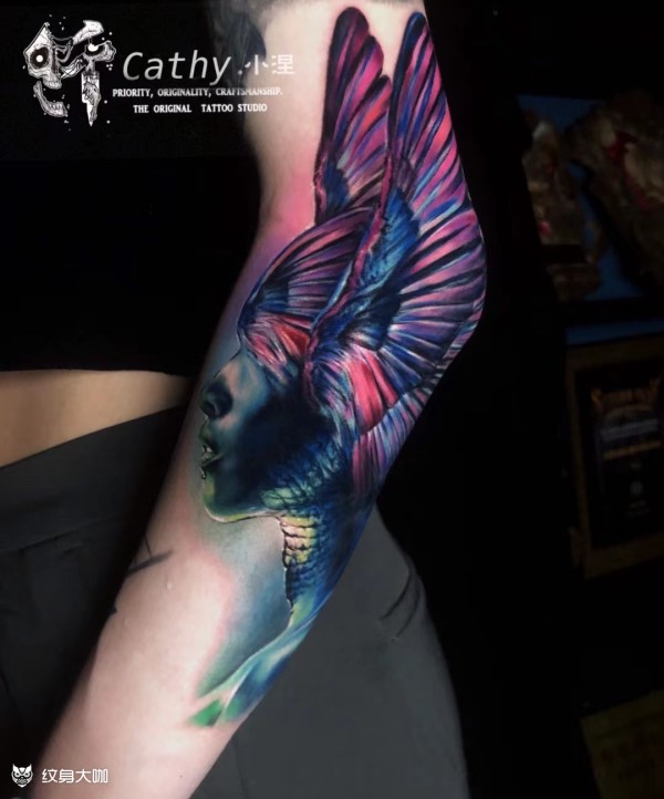 遮盖,一日工。羽毛根据手臂的走向设计在了肘部的位置在肘部活动的时候羽毛也会根据手臂的弯曲而呈现出更生动的视觉效果